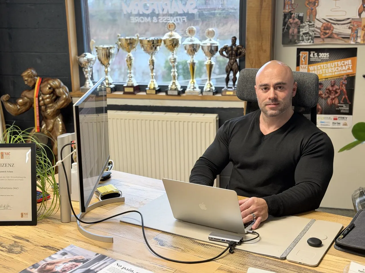 Ech sëtze beim Yannick Schott am Büro an hei ass alles iergendwéi massiv – net nëmmen de Bürosdësch an déi sëllege Pokaler, déi am Hannergrond virun der Fënster stinn, mee virun allem seng Äerm mat deem impressionante Muskelëmfang. Et kéint ee bal mengen, de Stoff vum Plower wär iwwerstrapazéiert a kuerz virum Räissen. Firwat de Yannick 2023 zu Istanbul als éischte Lëtzebuerger d’Weltmeeschterschaft am Bodybuilding gewonnen huet, ass mir elo absolut kloer. Datt hie sech 2024 dann och nach den Titel vum Mister Universum konnt sécheren, zementéiert seng sportlech Leeschtung an dësem Beräich. „Et war zimmlech emotional“, erënnert sech de Fitnessenthusiast: „An deem Moment denks de un déi vill Virbereedungsjoren an all d’Sacrificer, déi s de gemaach hues. An och un d’Leit, déi dech ëmmer ënnerstëtzt hunn, an deng Partnerin, déi wärend der Preparatiounsphas mat dir gelidden huet.“