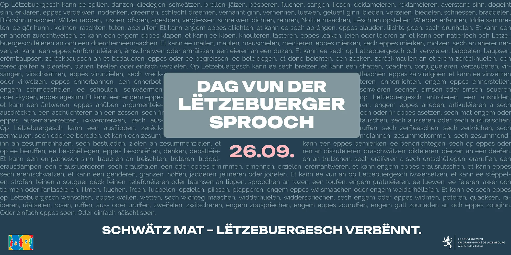 Doniewent sinn Aktivitéite virgesinn, fir d’Sprooch ze feieren. Mëttes trëtt am Kulturministère e Kannerchouer op. Dee Concert gëtt och gestreamt. Owes ass am „De Gudde Wëllen“ e coolen Hiphop-Concert mat engem Programm op Lëtzebuergesch. D’Leit sinn alleguer häerzlech agelueden, un all den Aktivitéiten deelzehuelen.